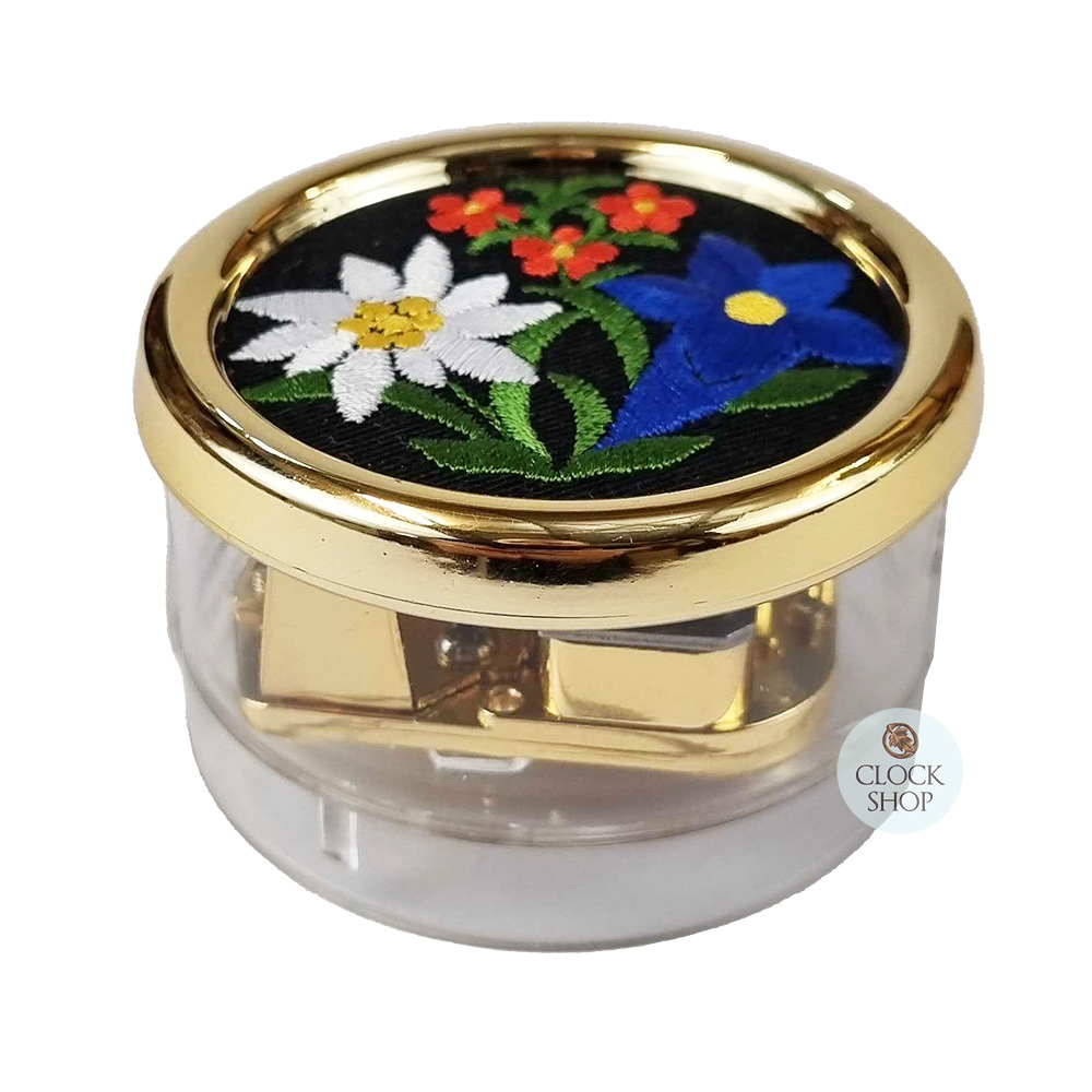 Round Acrylic Music Box With Embroidered Alpine Flowers (Edelweiss)