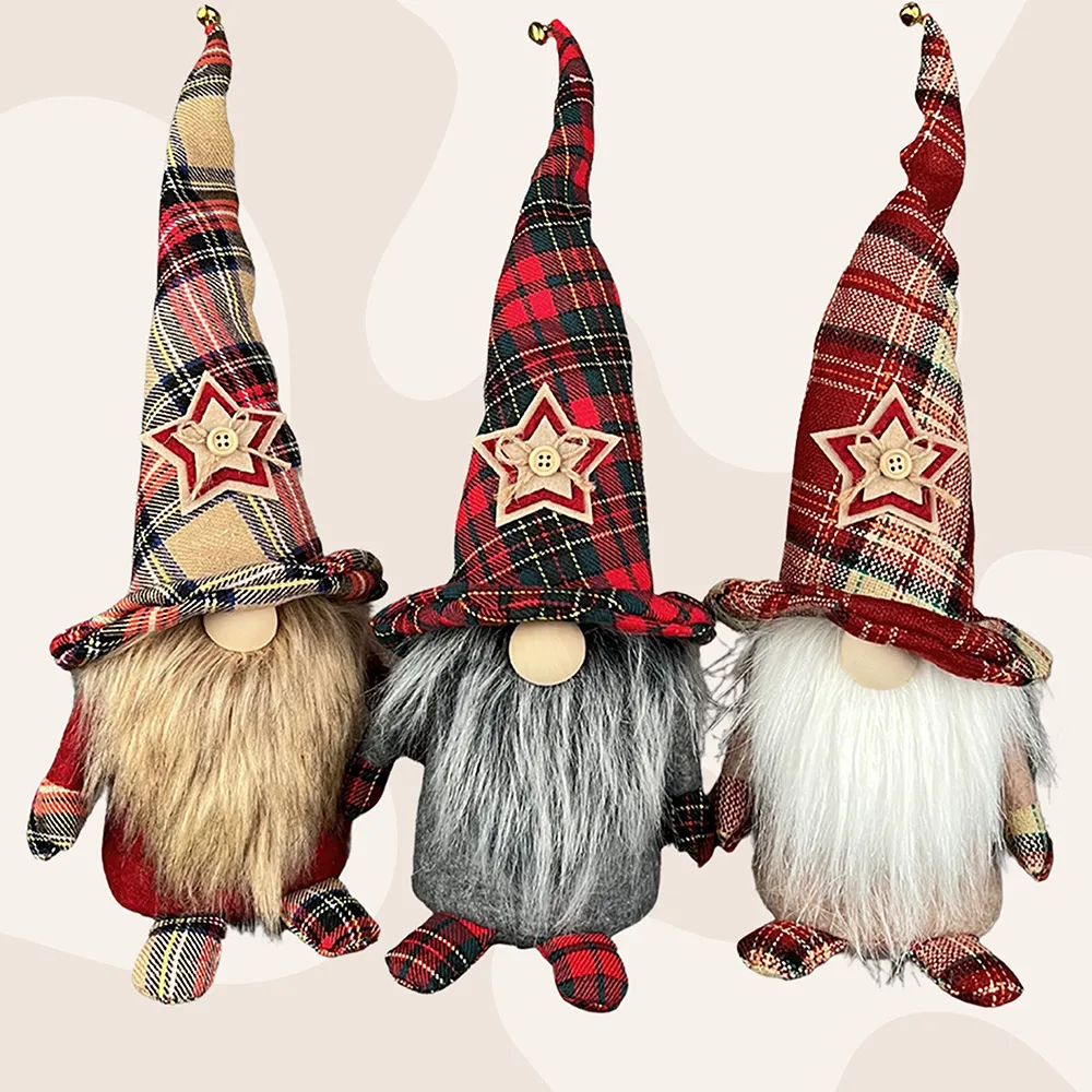 Introducing The O'Flannel Brothers, a spirited trio of 35cm protectors ready to bring the warmth of the Highlands to your holiday decor. This collection of tartan gnomes each sports a unique, high-peaked fabric tartan hat—from classic red and green plaid to earthy tans and snowy creams. Each brother is distinguished by his own faux-fur beard in shades of charcoal grey, sandy blonde, or winter white, yet they remain unified by the rustic, button-centered star gracing their hats and a tiny golden bell at the tip. Whether they are perched on a mantle or guarding the Christmas tree, these gnomes offer a perfect blend of cozy textile patterns for any festive home.