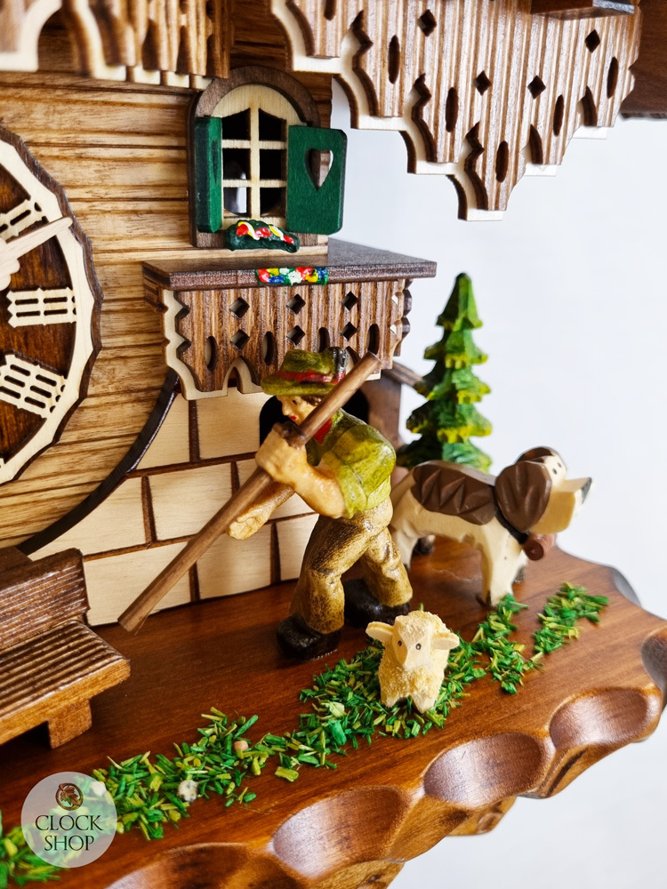 Measuring 42cm in height*, this endearing chalet style cuckoo clock portrays the scene of a chalet in the mountainous woodlands of Germany. The chalet features a colourful scene that includes various flora & fauna including sheep, as well as a walker, and colourful dancers situated on a balcony above the clock dial. Chalet cuckoo clocks are the most famous and common type of cuckoo clock, and are often shaped as alpine houses and feature carvings that represent life in the mountain region of Europe (mainly around Southern Germany, Switzerland and Austria). Chalet style cuckoo clocks can range from simple arrangements of carved features to very detailed scenes with many moving parts (known as automaton). The particular automaton for this cuckoo clock include the walker, waterwheel & dancers. Decorative display weights hang below the clock.