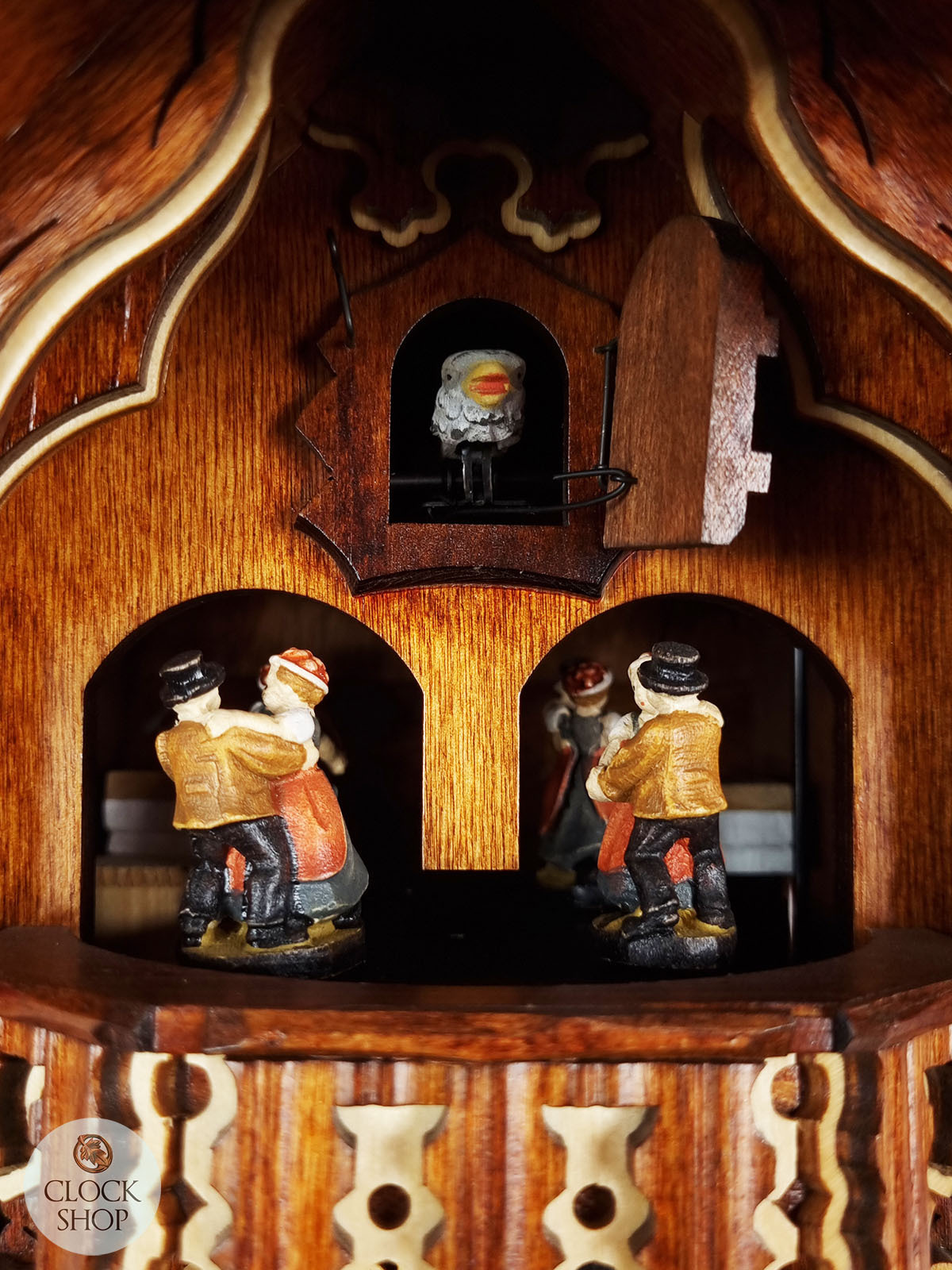 The in-built cuckoo of this clock calls the time each hour and once at half past through a door that opens. There are two melodies that alternate with this clock after the cuckoo calls - Edelweiss and Happy Wanderer. This particular clock is a 1 day mechanism, and therefore needs to be wound once a day. The particular automaton (moving parts) for this clock include the wood chopper who raises his arm when the cuckoo calls, and the water wheel, and the dancers on the balcony who twirl when the music plays on the full hour.